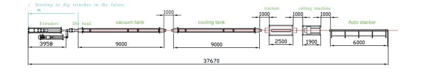 மூலப்பொருட்கள்+சேர்க்கைகள் → கலவை → வெற்றிட ஊட்டி → ஹாப்பர் ட்ரையர் → ஒற்றை திருகு எக்ஸ்ட்ரூடர் → வண்ணக் குறியீடு எக்ஸ்ட்ரூடர் → அச்சு மற்றும் அளவுத்திருத்தம் → வெற்றிடத்தை உருவாக்கும் இயந்திரம் → குளிரூட்டும் தொட்டி → டிரெய்லர் → கட்டிங் மெஷின் → முறுக்கு இயந்திரம்