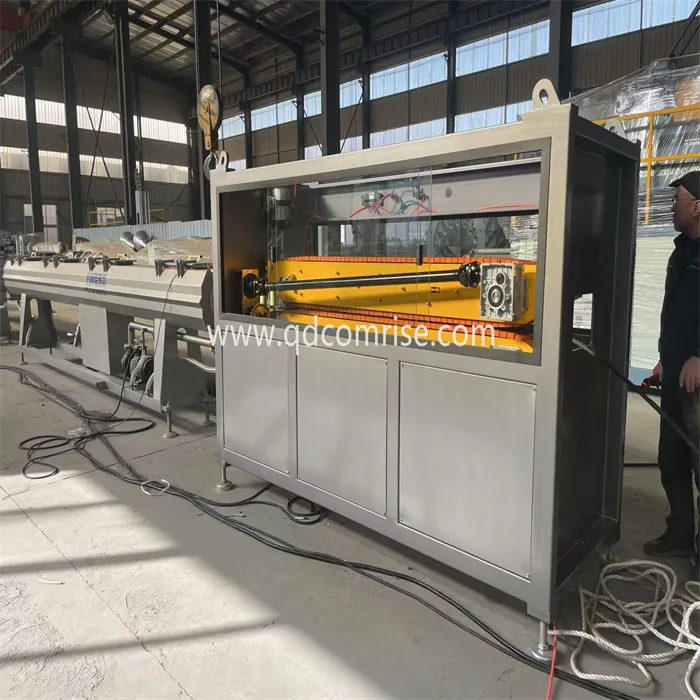 கட்டுப்படுத்தப்பட்ட வேகத்தில் உற்பத்தி வரி வழியாக குழாயை இழுக்கிறது.