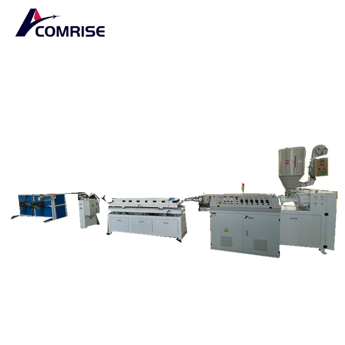 மூலப்பொருட்கள்+சேர்க்கைகள் → கலவை → வெற்றிட ஊட்டி → ஹாப்பர் ட்ரையர் → ஒற்றை திருகு எக்ஸ்ட்ரூடர் → வண்ணக் குறியீடு எக்ஸ்ட்ரூடர் → அச்சு மற்றும் அளவுத்திருத்தம் → வெற்றிடத்தை உருவாக்கும் இயந்திரம் → குளிரூட்டும் தொட்டி → டிரெய்லர் → கட்டிங் மெஷின் → முறுக்கு இயந்திரம்